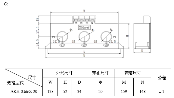 AKH-0.66 Z型系列三相導(dǎo)軌式電流互感器產(chǎn)品外形美觀,接線方便。外殼材料可選用曾強(qiáng)尼龍、PPT、透明聚碳酸酯、阻燃PC/ABS合金,作為交流電流信號(hào)采集元件,一般與AMC16、PZ-3O0配套使用,可減小電流互感器安裝空間和接線的煩瑣,為用戶降低成本。