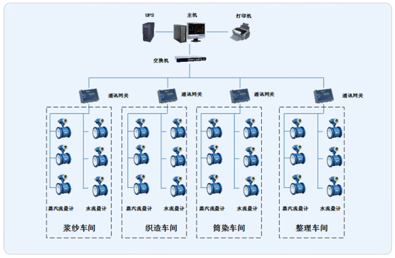 系統采用Acrel-5000型能耗監測系統,整個系統采用網絡分布式結構,監控主機位于現場數據機房中,現場主要監測儀表為水、蒸汽的流量計,位于現場4個生產車間內。該項目實現了常州強聲紡織有限公司內能源的智能管理。所有監控設備均通過屏蔽雙絞線至各自車間內的通訊管理機,再通過光電轉換器經過光纖將數據傳輸至數據中心,從而實現遠程監控。