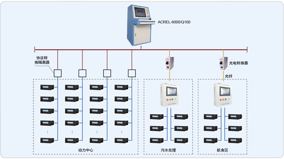 系統(tǒng)采用分層分布式結(jié)構(gòu),站控管理層及現(xiàn)場設(shè)備層,站控管理層設(shè)備為我公司一套琴臺式電氣火災(zāi)監(jiān)控設(shè)備及2套壁掛式電氣火災(zāi)監(jiān)控設(shè)備,對分散在各區(qū)域內(nèi)的ARCM剩余電流式電氣火災(zāi)監(jiān)控裝置進(jìn)行遙測、遙信,實現(xiàn)監(jiān)控與管理。各區(qū)域內(nèi)探測器采用RS485總線直接接入琴臺式電氣火災(zāi)監(jiān)控設(shè)備。系統(tǒng)采用Acrel-6000電氣火災(zāi)監(jiān)控系統(tǒng),實現(xiàn)對被保護(hù)電氣線路的實時監(jiān)測。