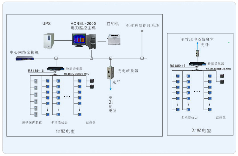 系統(tǒng)采用Acrel-2000型電力監(jiān)控系統(tǒng),監(jiān)控主機(jī)位于1#配電室內(nèi)電力監(jiān)控值班室,2#配電房距離值班室較遠(yuǎn),通過(guò)通訊管理機(jī)將采集的數(shù)據(jù)經(jīng)處理后經(jīng)光纖收發(fā)器和光纜上傳至位于1#配電室內(nèi)電力監(jiān)控值班室;所有配電回路均配備安科瑞電力儀表ACR系。該項(xiàng)目實(shí)現(xiàn)了13號(hào)地塊電力系統(tǒng)的智能管理。所有監(jiān)控設(shè)備均通過(guò)屏蔽雙絞線(xiàn)至各自配電室內(nèi)的通訊管理機(jī),再通過(guò)光電轉(zhuǎn)換器經(jīng)過(guò)光纖將數(shù)據(jù)傳輸至1#配電室內(nèi)電力監(jiān)控值班室,從而實(shí)現(xiàn)遠(yuǎn)程監(jiān)控。