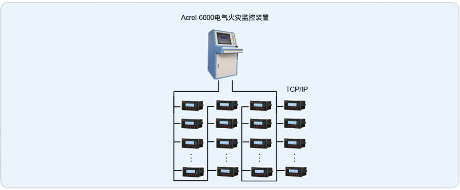 本項目上現(xiàn)場配電箱內(nèi)安裝ARCM200L-J1漏電火災(zāi)探測器配合AKH-0.66L剩余電流互感器,消防控制室內(nèi)安裝有Acrel-6000電氣火災(zāi)監(jiān)控主機。安科瑞漏電火災(zāi)探測器均采用Modbus-RTU通訊協(xié)議,RS-485接口,通過兩條屏蔽雙絞線連接至監(jiān)控主機。