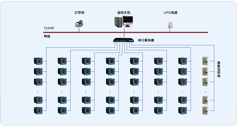 整個系統采用分布式結構,網球中心整個配電系統分為高低壓兩個部分,分別位于高壓變電所及低壓變電所,電力監控系統位于配電室旁邊的電力監控值班室。其中高壓配電室共計5個回路,分別為10KV進線1、10KV進線2、1#變壓器出線、2#變壓器出線及聯絡;低壓變電所共計145個回路,分別采用ACR220E及ACR220ELH,其中ACR220ELH安裝于低壓進線及發電機進線中。本系統網球中心電力監控數據均通過奧體中心內部局域網,將數據通過Modbus TCP的方式上傳至奧體中心數據中心,同時在廣州市供電局10樓設置電力監控系統工作站,數據通過網絡公司局域網,通過廣東省104規約傳輸至供電局調度中心。