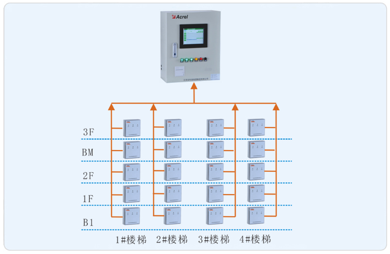 系統(tǒng)采用安科瑞防火門(mén)監(jiān)控系統(tǒng),該系統(tǒng)主要采用分層分布式網(wǎng)絡(luò)結(jié)構(gòu),系統(tǒng)結(jié)構(gòu)為:站控管理層、網(wǎng)絡(luò)通訊層和現(xiàn)場(chǎng)設(shè)備層。其中黃巖博物館項(xiàng)目現(xiàn)場(chǎng)設(shè)備分布為B1至3F常閉防火門(mén)。該系統(tǒng)監(jiān)控所有樓道內(nèi)的常閉防火門(mén)且實(shí)時(shí)監(jiān)測(cè)防火門(mén)狀態(tài),如有異常會(huì)后臺(tái)報(bào)警。所有監(jiān)測(cè)模塊通過(guò)二總線鋪設(shè)至消防控制室,防火門(mén)監(jiān)控主機(jī)從而完成對(duì)監(jiān)測(cè)模塊的采集并監(jiān)控。
