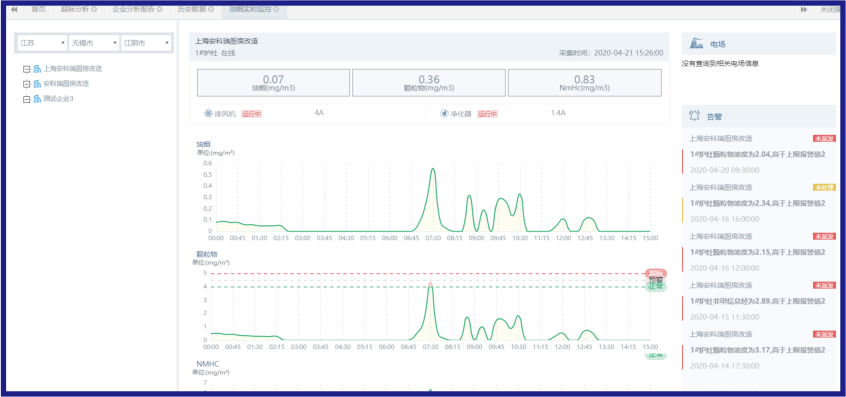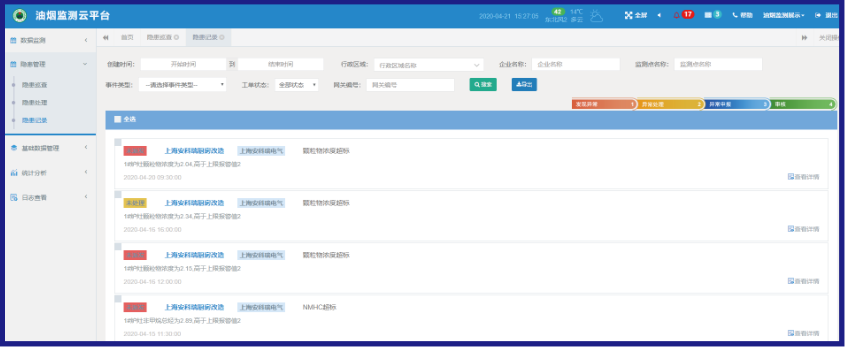 平臺GIS地圖采集餐飲油煙處理設(shè)備運(yùn)行狀態(tài)和油煙排放的濃度數(shù)據(jù),自動對超標(biāo)排放及異常企業(yè)進(jìn)行提示預(yù)警,可迅速進(jìn)行處理,督促餐飲企業(yè)整改設(shè)備,并定期清洗、維護(hù),實(shí)現(xiàn)減排環(huán)保,不擾民等目的。